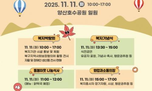 광주광역시 북구(구청장 문인)는 오는 11일 양산호수공원 일대에서 '복지한마당' 행사를 개최한다고 10일 밝혔다.이번 행사는 '주민이 복지 피움'이라는 주제로 민·관 복지시설 종사자, 지역사회보장협의체 위원, 지역 주민 등 700여 명이 한자리에 모여 노고를 격려하고 복지사업 성과를 공유하기 위해 마련됐다.올해로 3회째를 맞는 '복지한마당...