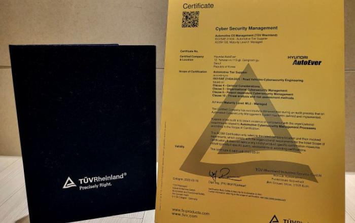 현대오토에버는 차량 사이버 보안 국제 표준인 ‘ISO/SAE 21434’를 준수해 글로벌 시험·인증 기관인 독일의 TUV 라인란드(TUV Rheinland)로부터 사이버 보안 관리 체계(CSMS: Cyber Security Management System) 인증을 획득