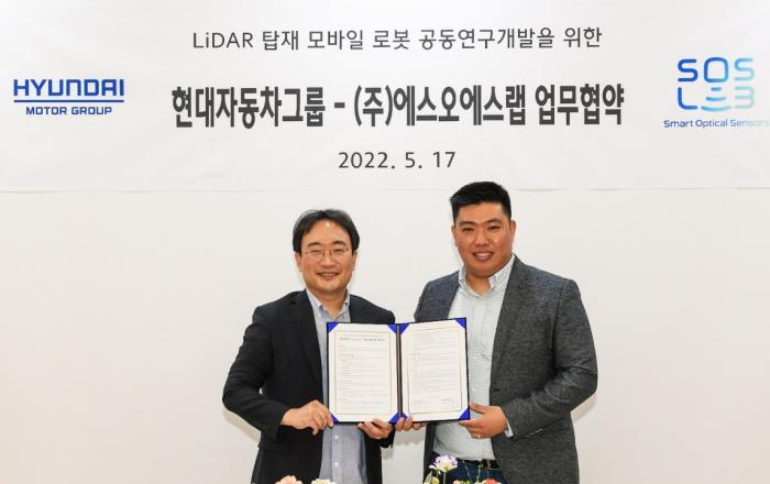 현대자동차그룹이 모바일 로봇 개발 가속화를 위해 고정형 라이다 센서 전문업체인 에스오에스랩과 협력한다.현대자동차그룹은 17일(화) 의왕연구소에서 현대자동차그룹 현동진 로보틱스랩장, 에스오에스랩 정지성 대표이사 등 양사 관계자들이 참석한 가운데 에스오에스랩과 ‘모바일 로