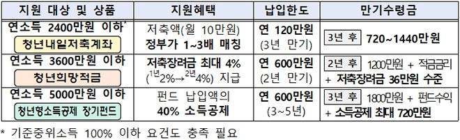 이에 따라 연 120만원씩 총 3년을 납입하면 최종 720만~1440만원을 수령하게 된다. 수급자 및 차상위 청년의 경우 저축액에 정부가 최대 3배까지 매칭해 3년 뒤 총 1440만원의 적립금과 예금이자를 받는다. 수급자 및 차상위 청년은 추가적 지원 필요성에 따라 15~39세까지로 가입 연령을 확대하고 연간 근로·사업소득 기준을 적용하지 않을 예정이다.