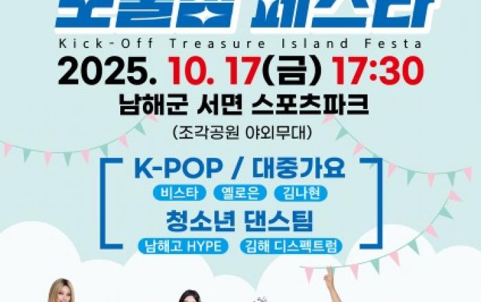 남해군은 오는 17일(금) 오후 5시 30분 서면 스포츠파크(조각공원 야외무대)에서 '킥 오프! 보물섬 페스타'를 개최한다고 밝혔다.
