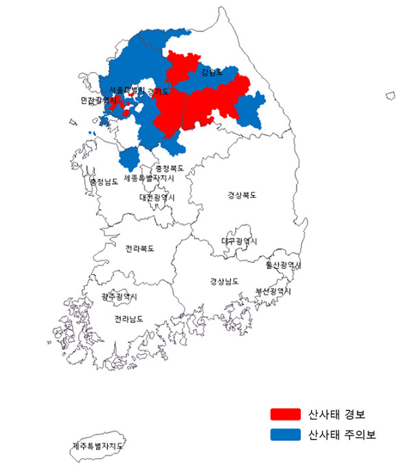 이와 별도로 산림청이 광역자치단체 단위로 발령하는 산사태 위기경보 단계의 경우 서울, 인천, 경기, 강원 등 4개 시도에 대해 ‘주의’에서 ‘경계’로 상향됐다.