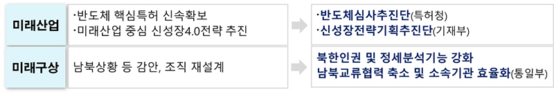 미래대비 분야는 반도체분야 특허심사 전담조직을 설치해 반도체산업의 글로벌 경쟁력을 강화하고, 남북상황 등 여건에 따른 유연한 조직 운영을 위해 통일부 조직구조를 개편한다.